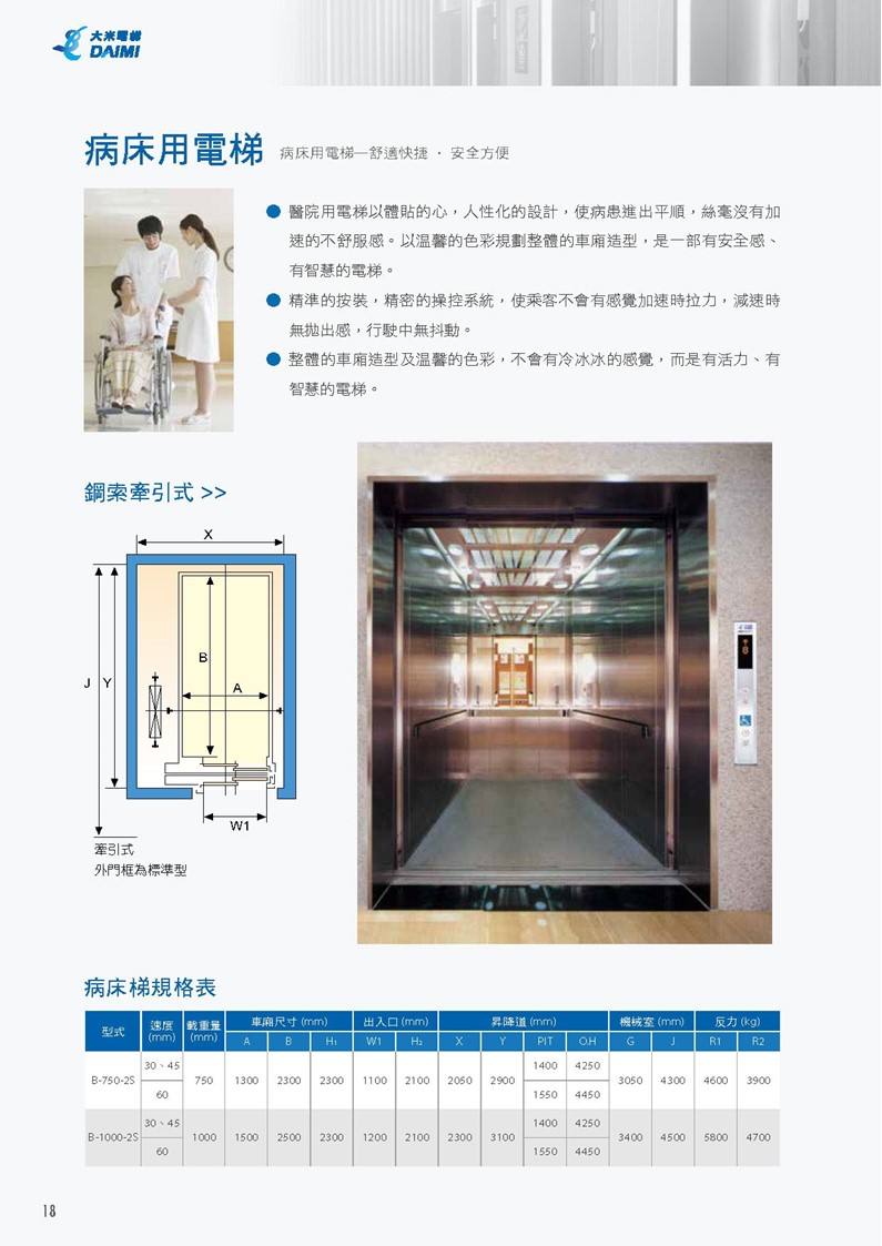 醫院用電梯以體貼的心,人性化的設計,使病患進出平順,絲毫没有加速的不舒服感。 精準的按裝,精密的操控系統,使乘客不會有感覺加速時的拉力,減速時的拋出感,或行駛中的抖動。 整體的車廂造型及溫馨柔和的燈光照明,不會有冷冰冰的感覺,病患運送搭乘過程中亦不會有不適感。 控制系統可平順地調整速度,加上極精準的車廂水平調整功能,提升了搭乘舒適度。 低摩擦起重功能減少噪音和震動、提升乘客的舒適度,並且將對周圍區域的干擾減至最低。 車廂具備堅固的結構與絕佳的隔音功能,可確保乘客擁有平順而安靜的搭乘體驗。